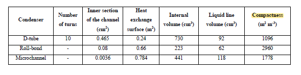 The compactness is a geometric criterion defined as the exchange surface to internal volume ratio. As shown in the table below the roll-bond heat exchanger has the highest compactness.